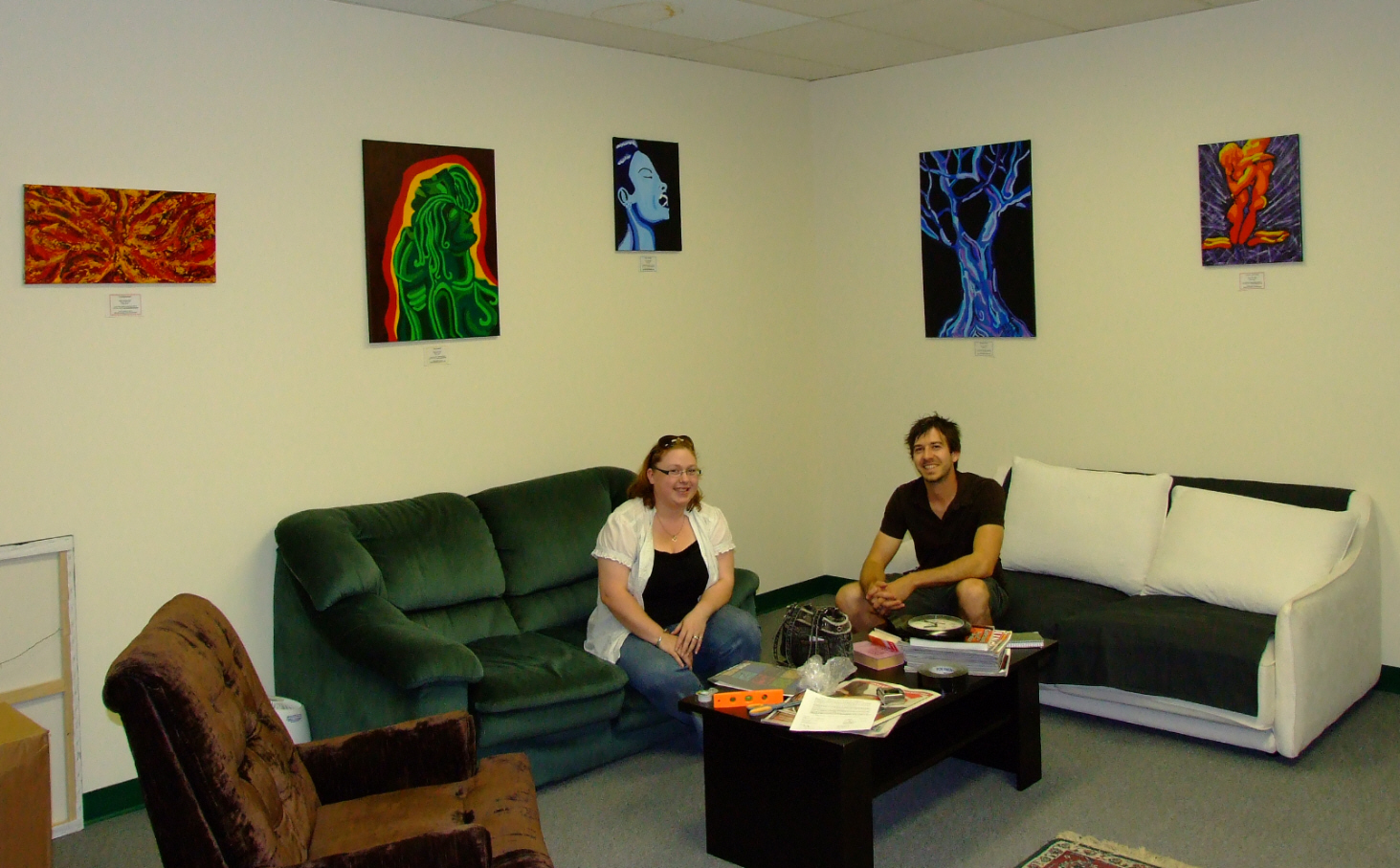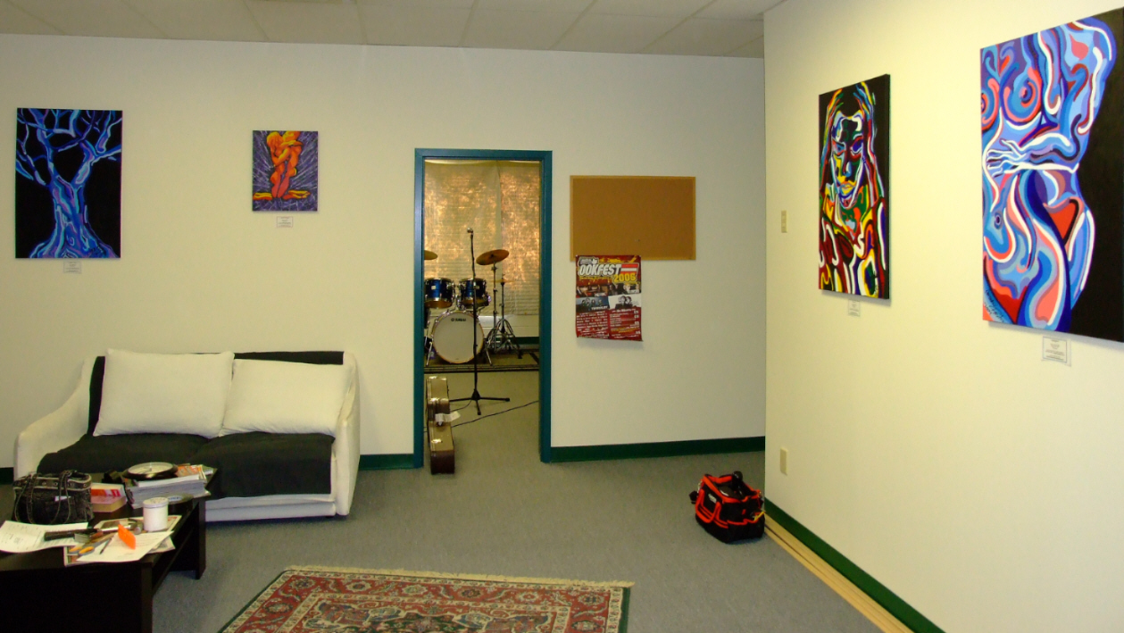 So I called said ad poster, Jonny, back and made arrangements. To make a long story short, J drove me over and mounted my work and now Jonny has 7 of my paintings on display until October 4th. Pretty sweet eh! I’m hoping I’ll maybe make a couple of sales/commissions or get asked to do a album cover. Either way, it gets my stuff out of the house and seen.