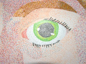 I decided I’d be ambitious and try to pull it off in pointillism style. (aka a zillion little dots) The medium I used was marker. Here are a few detail shots for you.