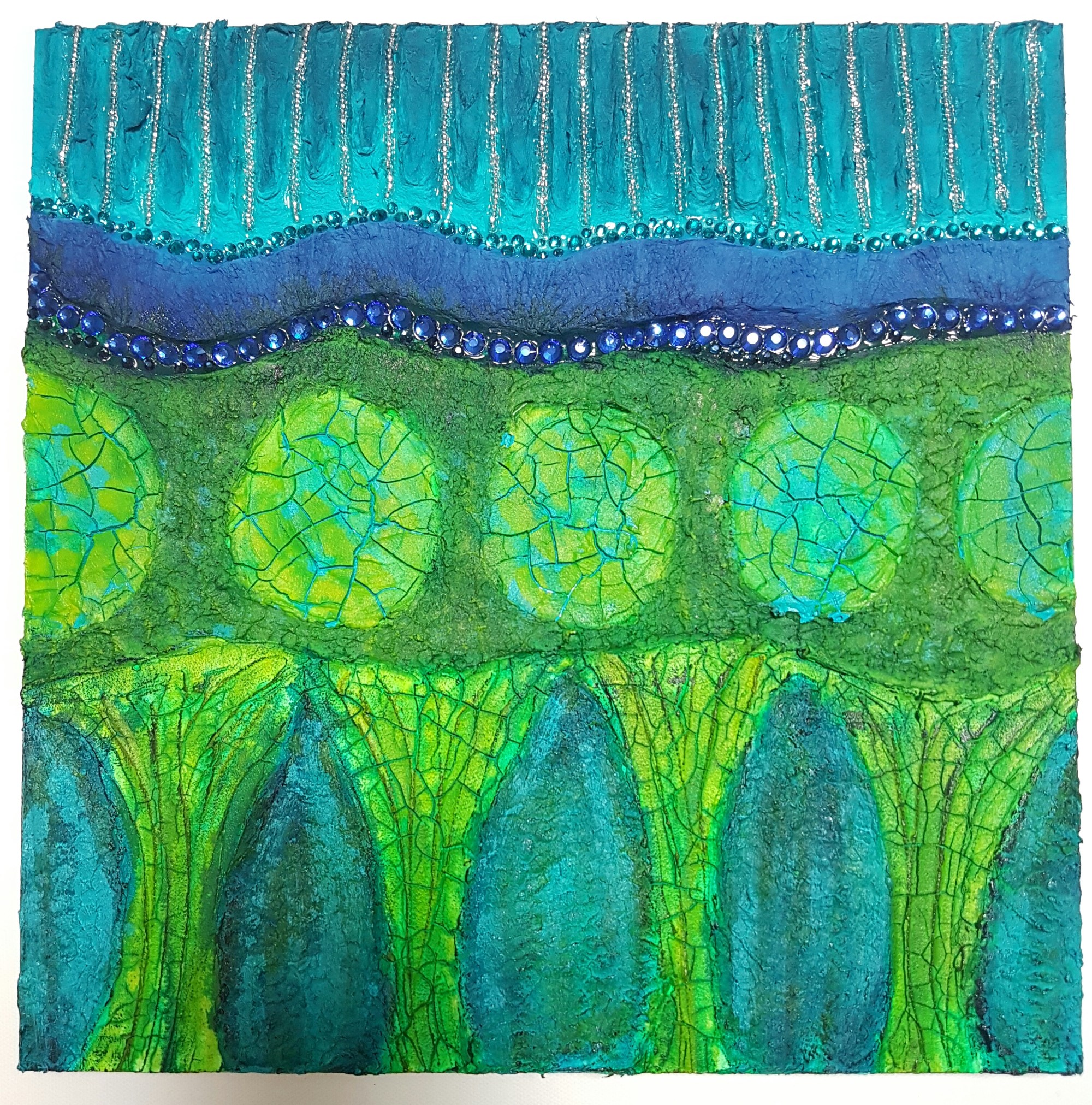 For the 3D pieces I’ve really been enjoying incorporating beads and rhinestones into the pieces to add more interest and reflective qualities. I’m working on a series in this style for an exhibit in June at City Hall. I can’t wait to see them all displayed together.