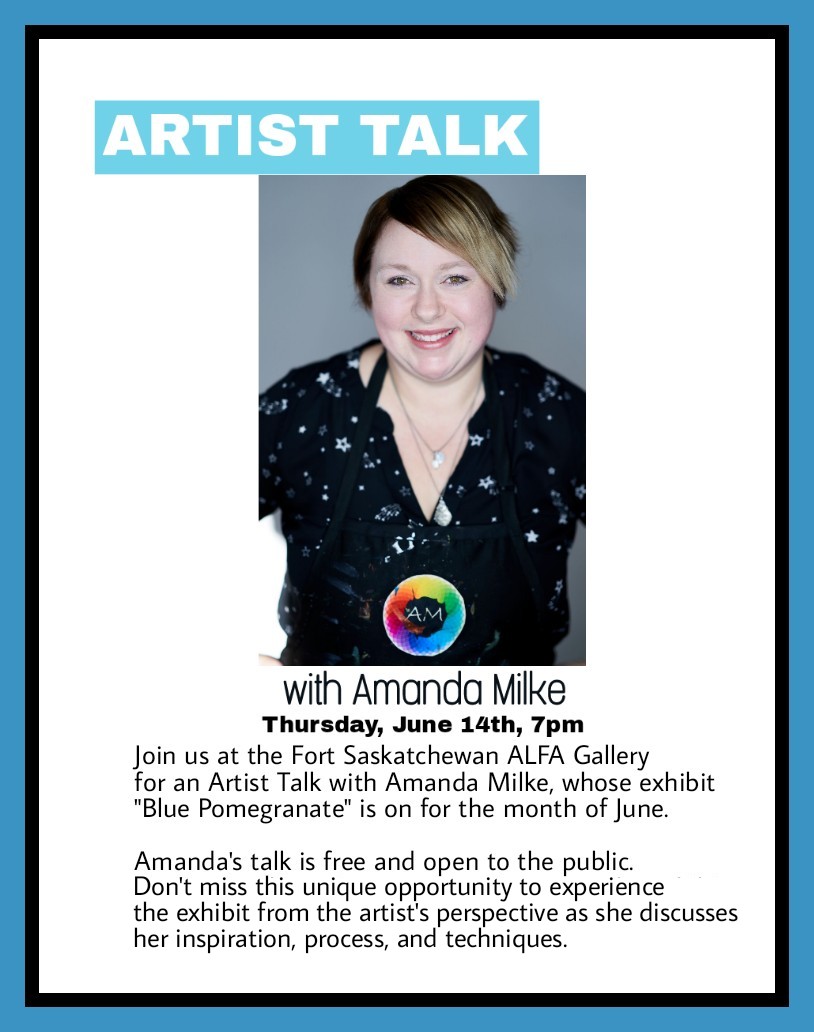 My Exhibit “Blue Pomegranate” will be on display for the month of June with the official meet and greet happening on June 11 at 7pm and the Artist Talk happening on June 14th at 7pm at the ALFA (Alberta Lottery Fund Art) Gallery for “The Talk”  The gallery is located in the heart of the Sherritt Cultural Pavilion at the Dow Centennial Centre 8700 84 St, Fort Saskatchewan, AB T8L 4P5