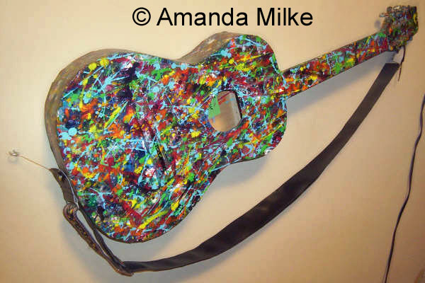 An artist living in Alberta, Canada, Milke specializes in painting with acrylic. Her subjects include musical instruments. That is, she paints musical instruments. Sounds straightforward, doesn’t it? But when Amanda paints a musical instrument, the instrument is her canvas. The result isn’t just an object with paint on it, but a painting, albeit in an unconventional form.