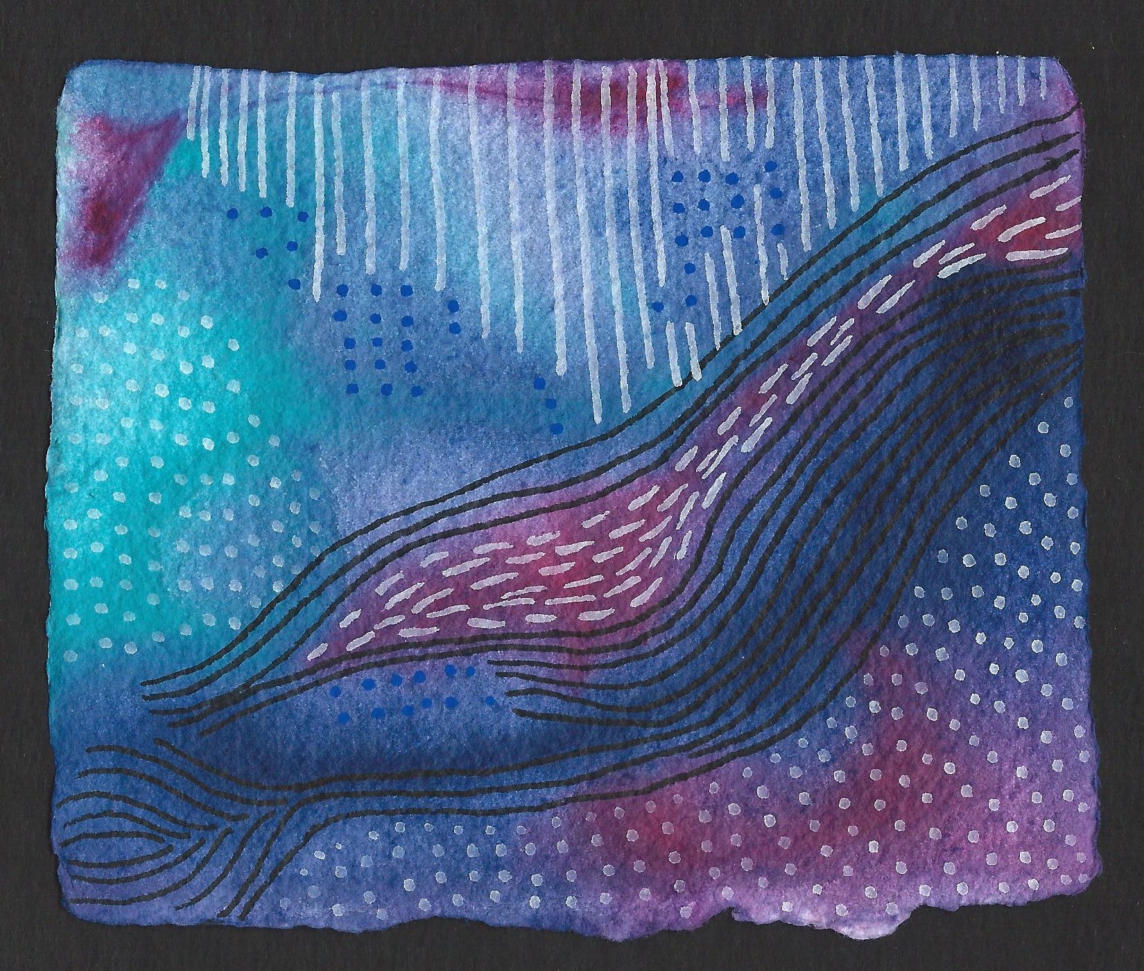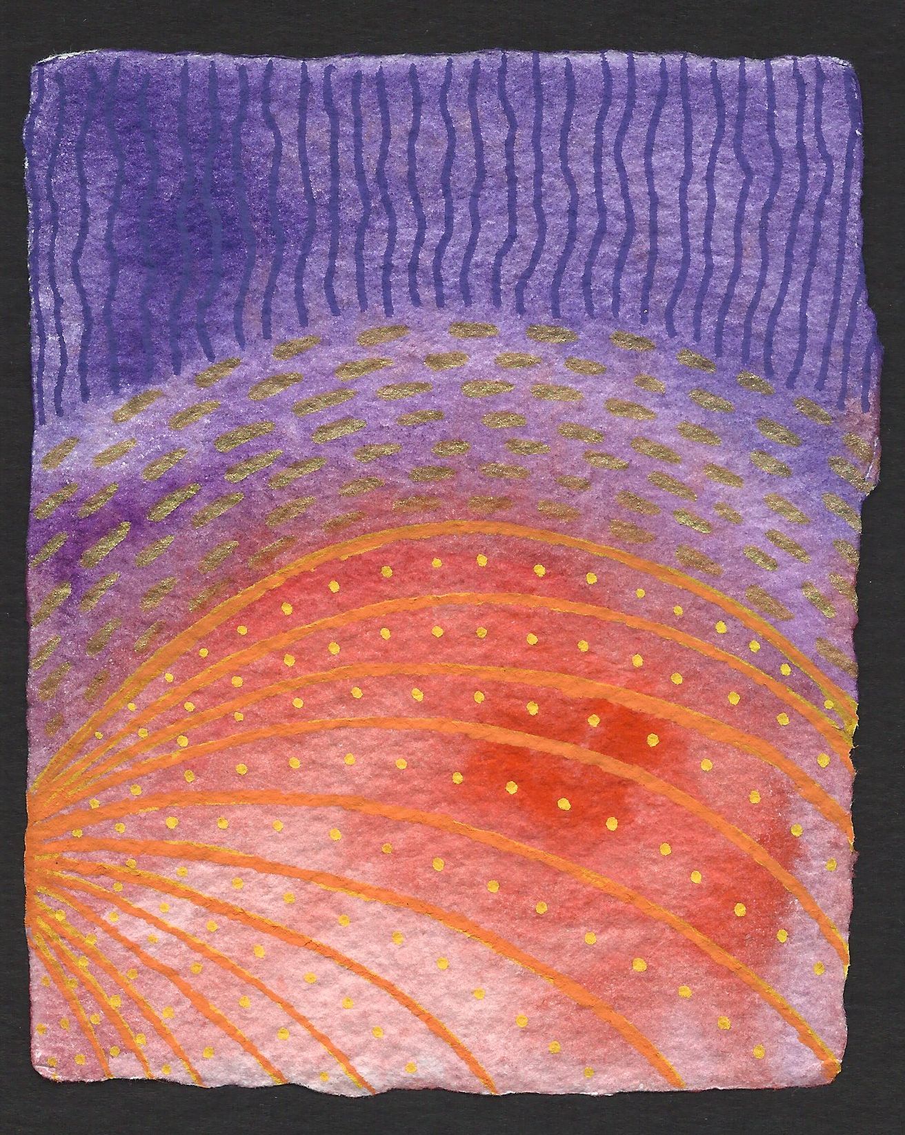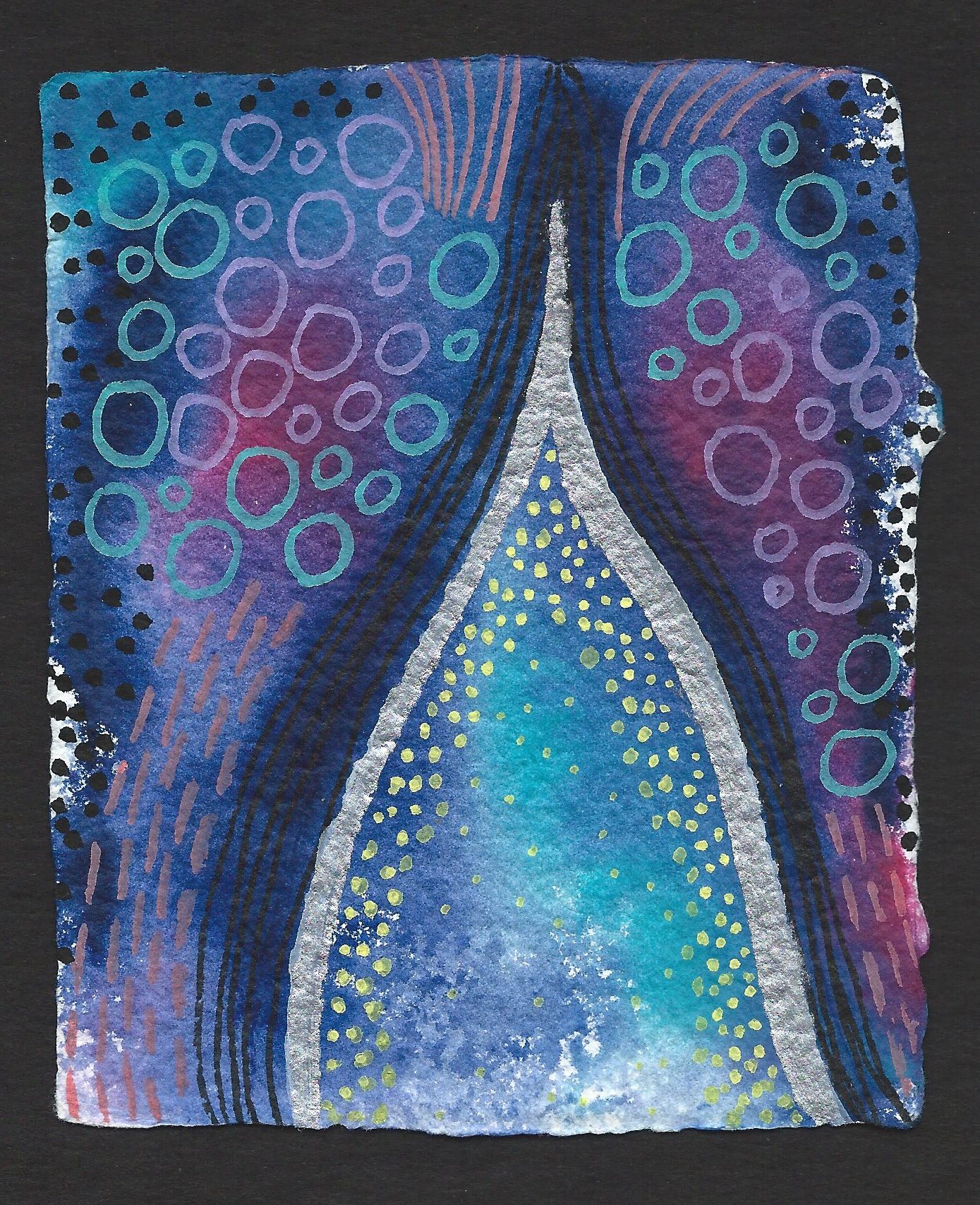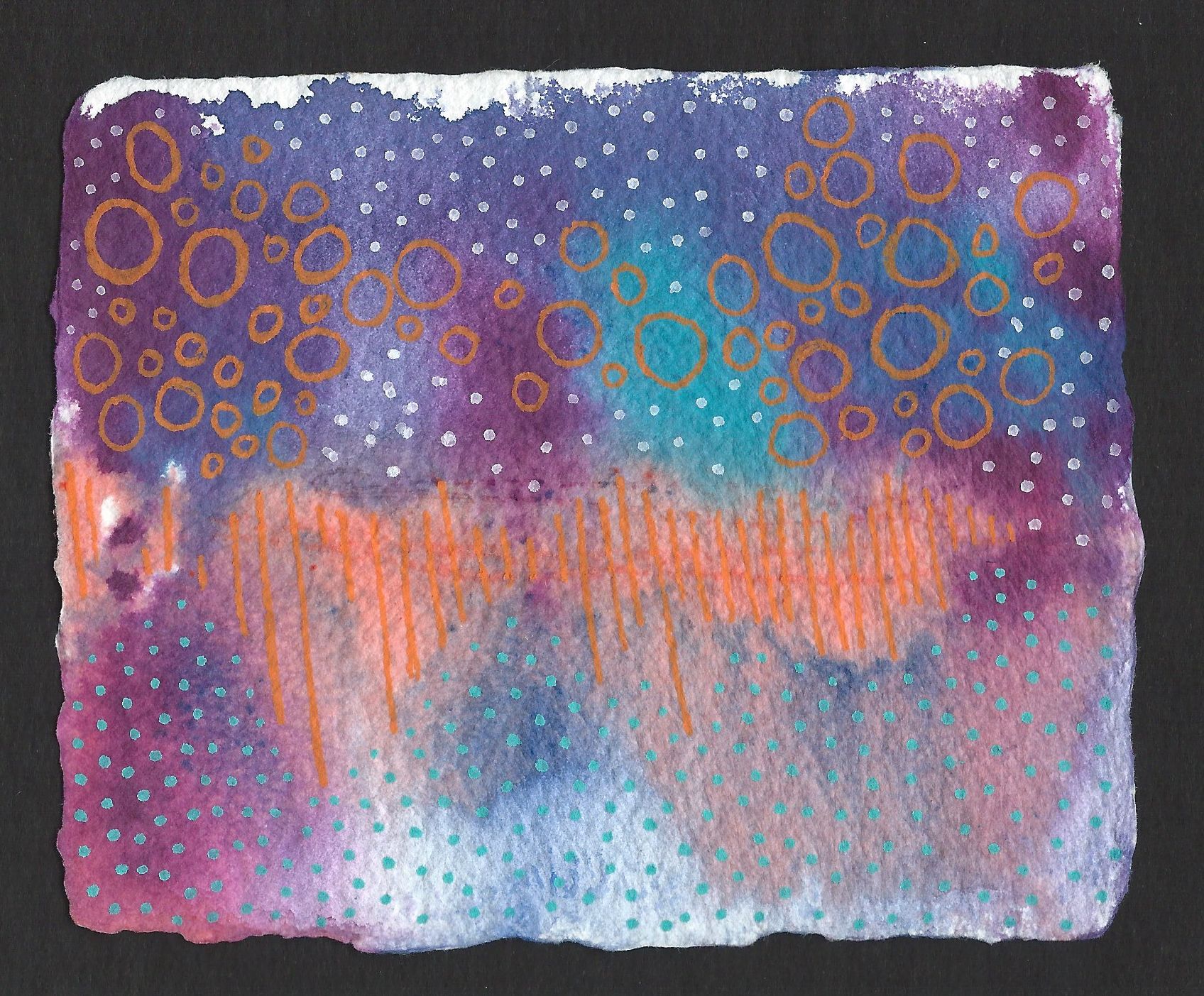 Each mixed media painting in this series is created on 4″ x 5″ watercolor paper that is handmade in Montreal and then mounted on 6″ x 8″ black mat board ready to frame. Each piece is $20