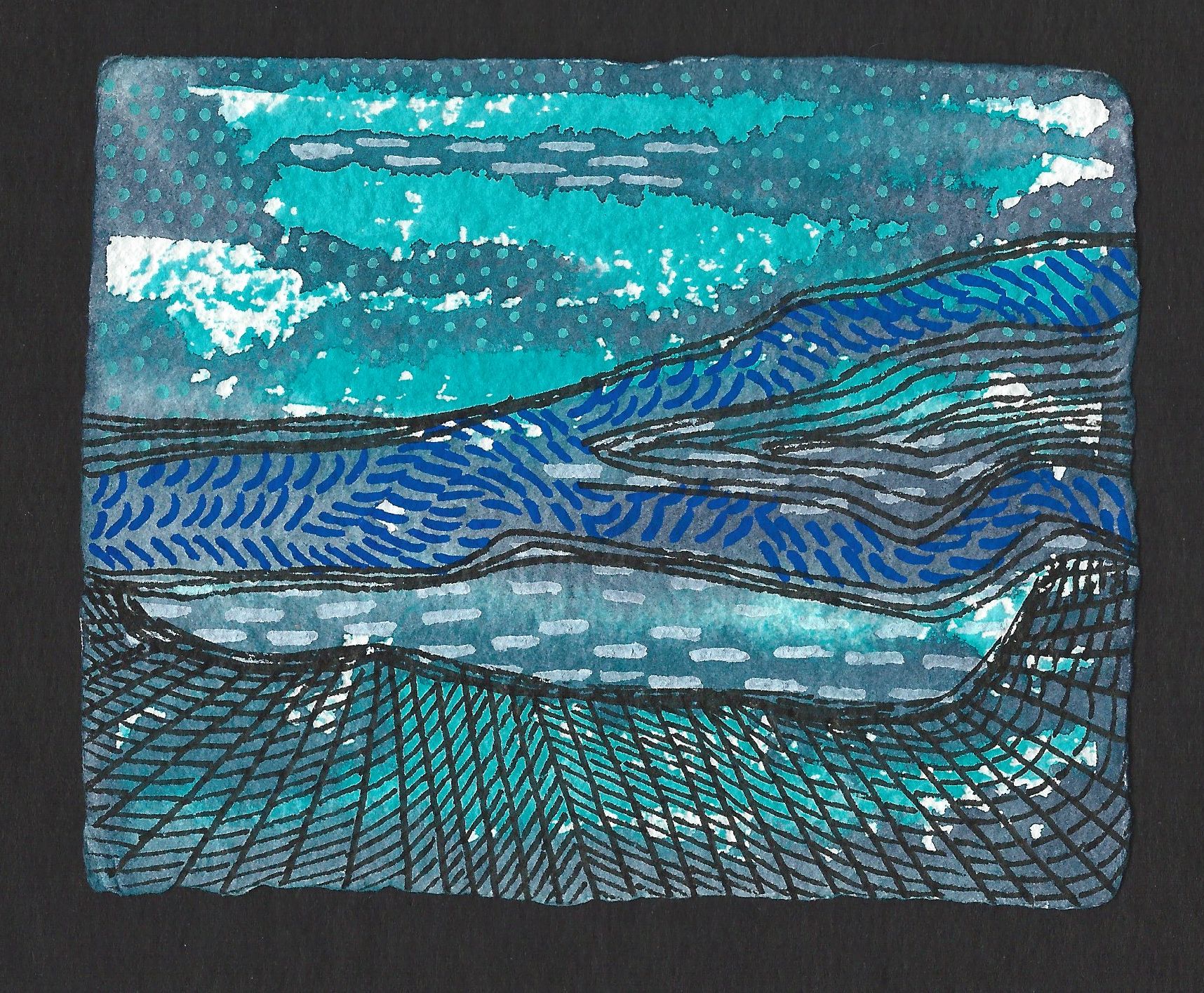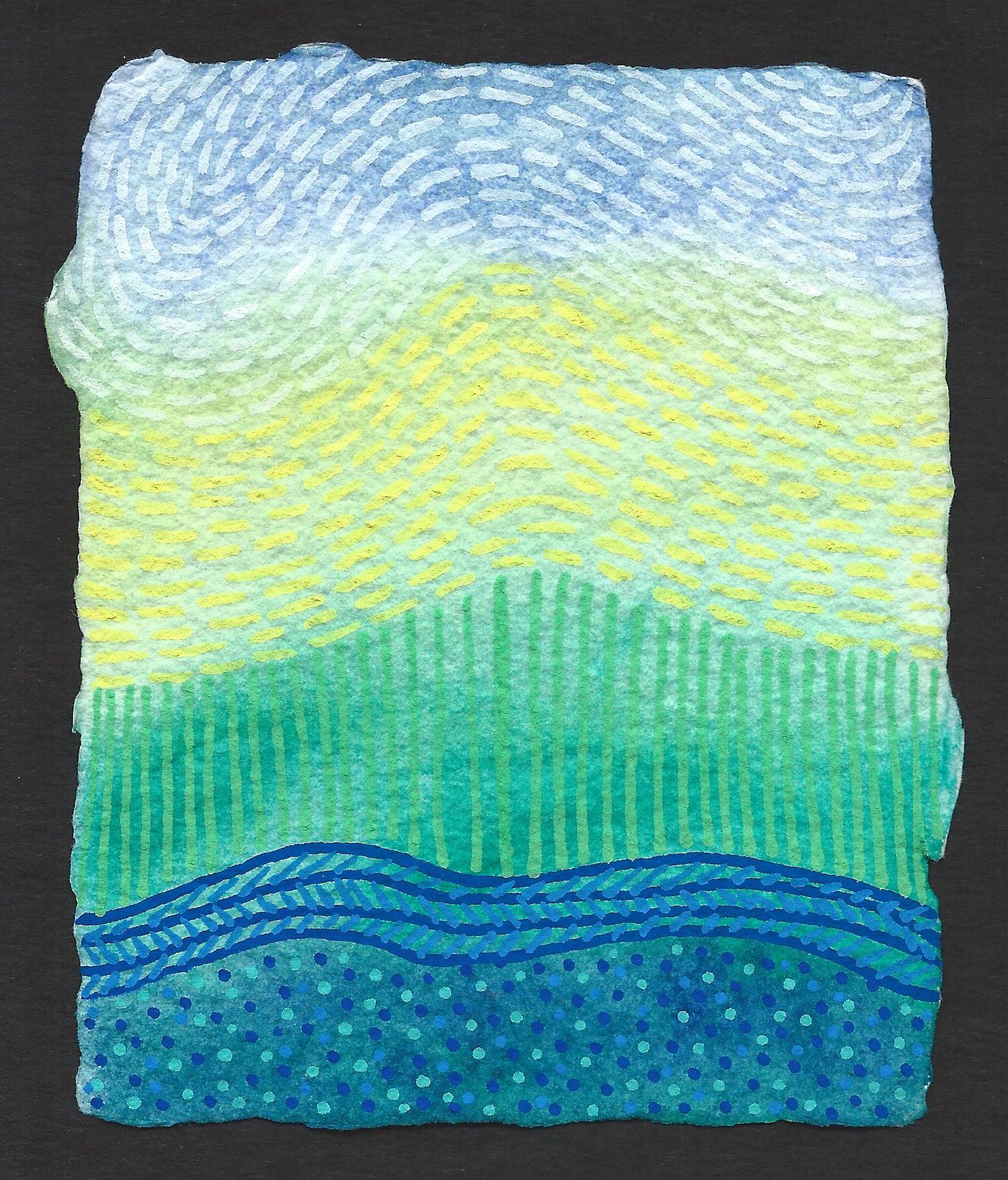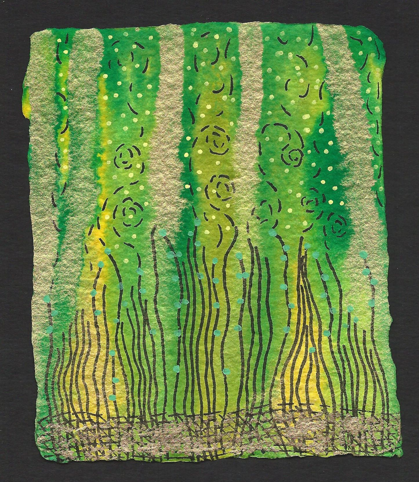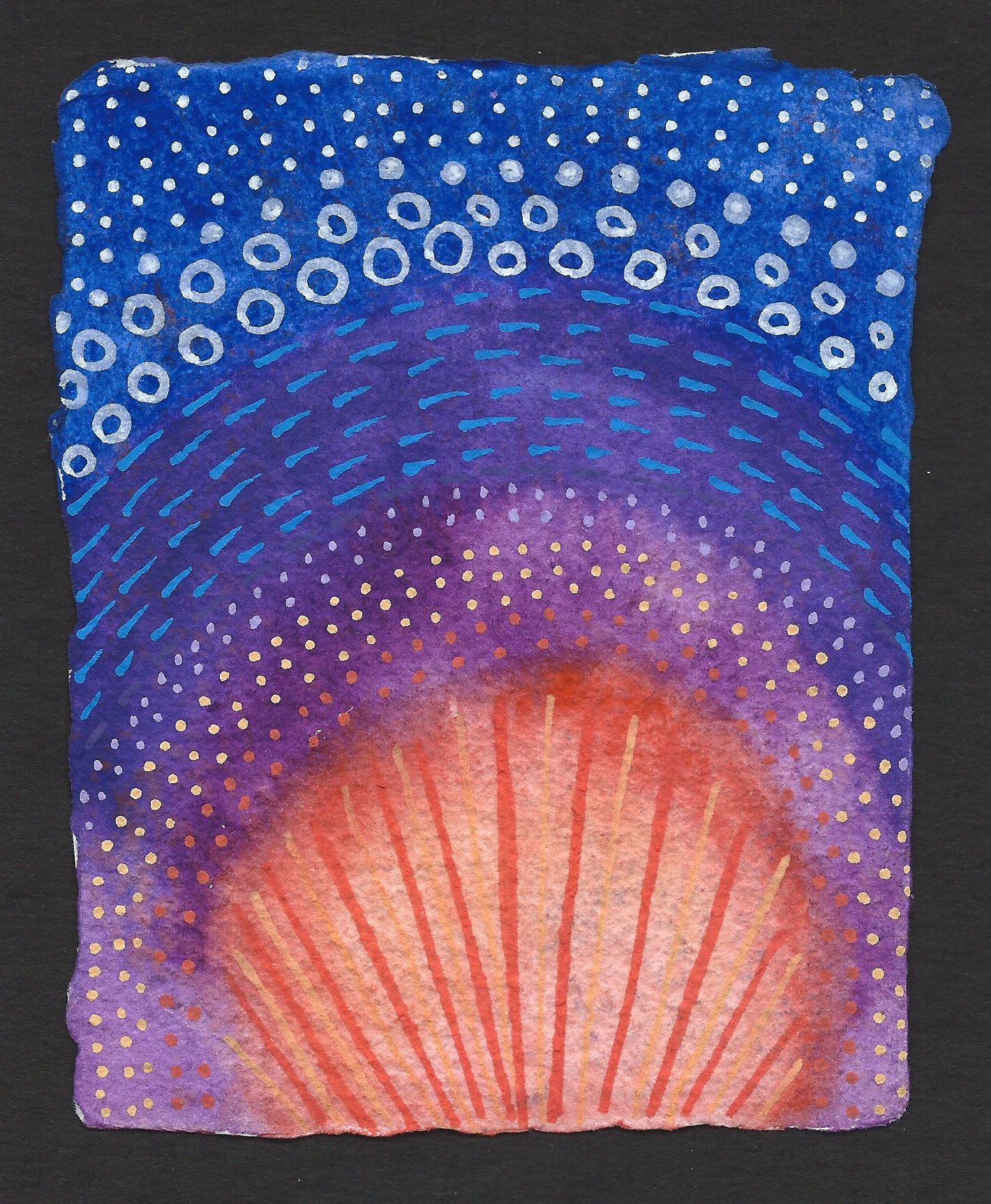 Each mixed media painting in this series is created on 4″ x 5″ watercolor paper that is handmade in Montreal and then mounted on 6″ x 8″ black mat board ready to frame. Each piece is $20