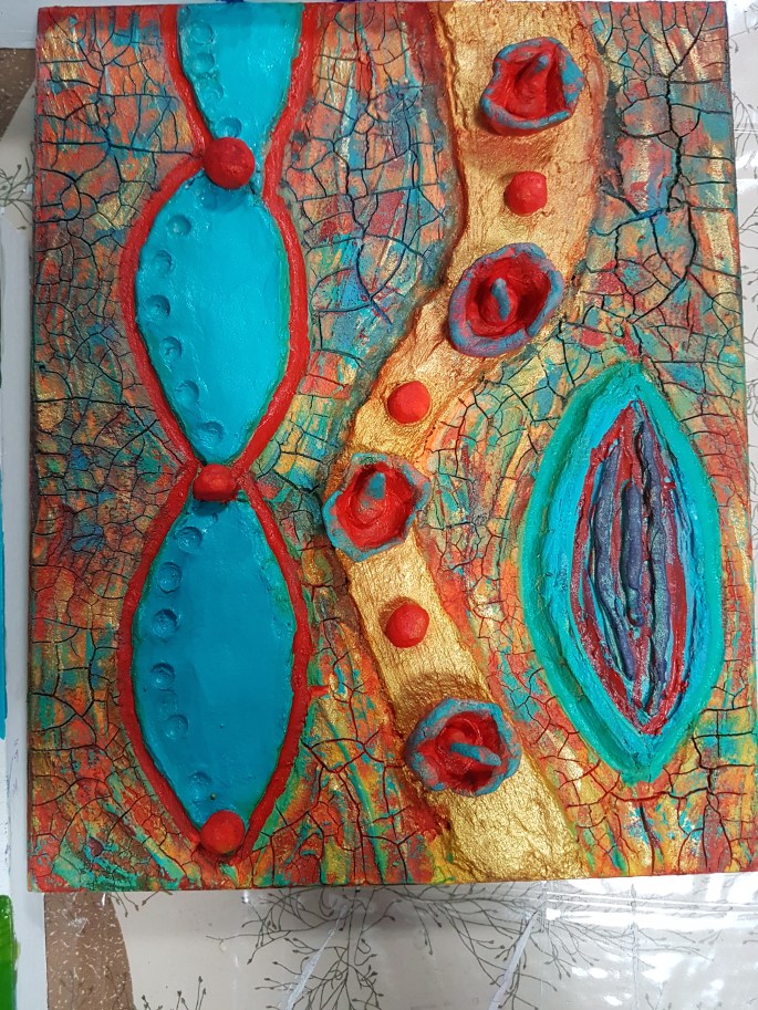 This painting is gritty and cracked and the inside is flawed but shines with Gold because inside that is exactly what God is doing in my life and is the truest testament I can give. If you pass over your brokenness, God will repair you, the vessel he loves and values. I am proof, because Iβve traded in these broken pieces for beautiful healing golden repairs: Abandonment, Rape, Neglect, Abuse, Depression, Suicide, Loss, Divorce, Anger, Fear, Infertility and Loneliness.