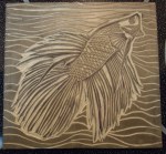 After that, I mounted the lino on to wooden blocks and pressed them down with my detergent bottle.